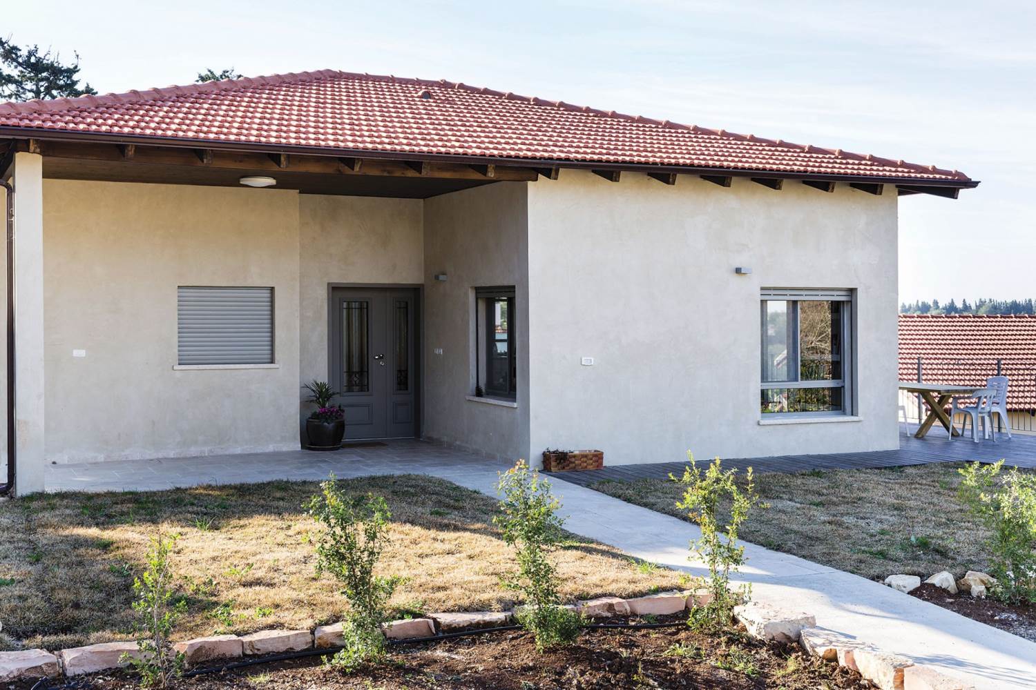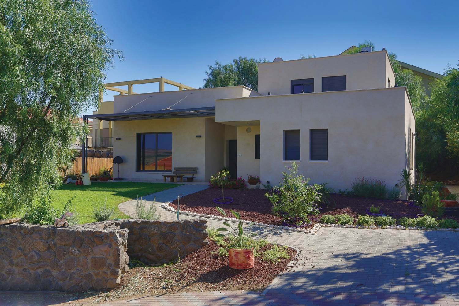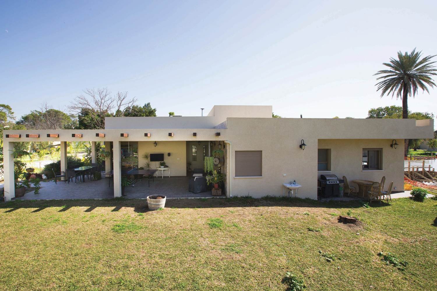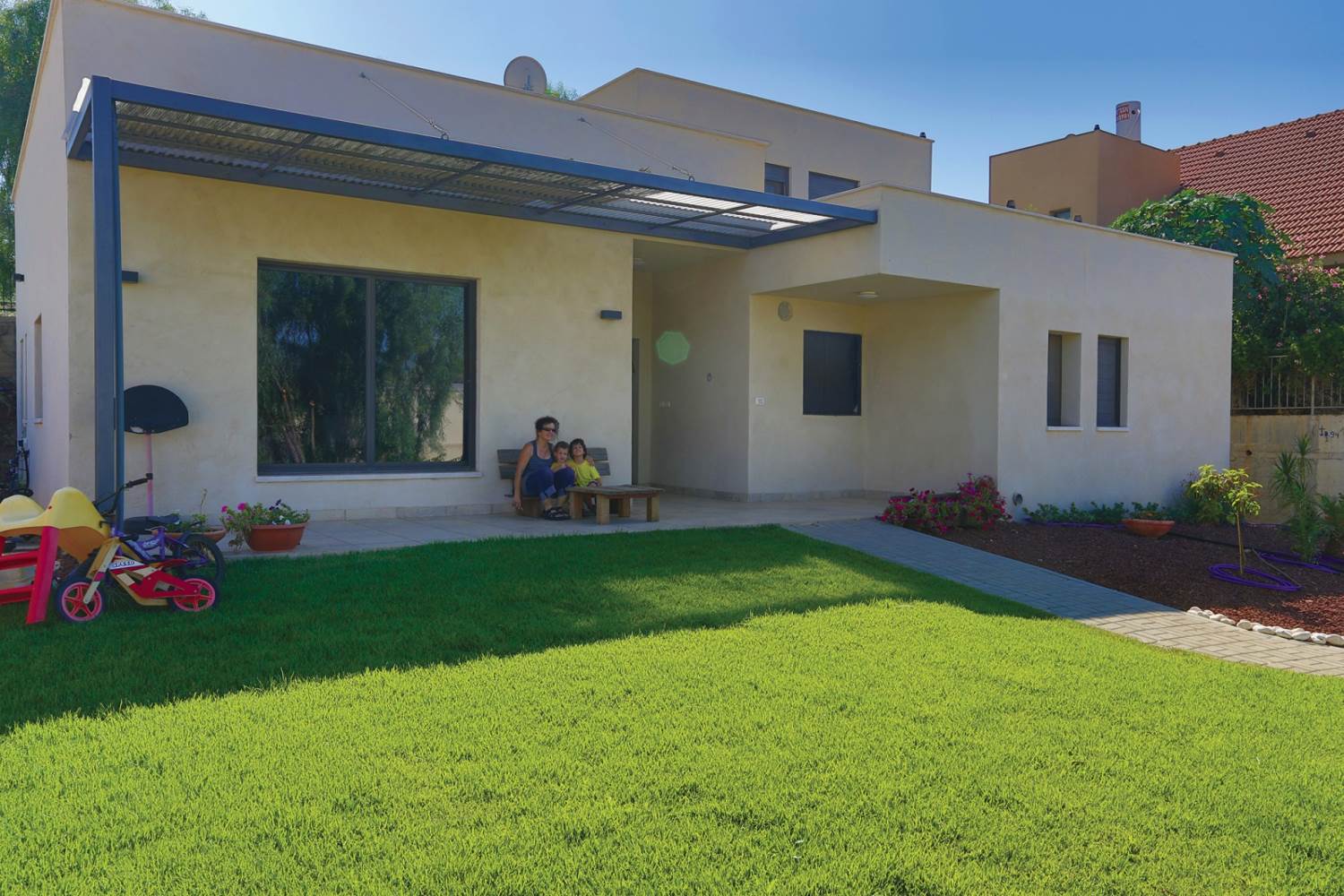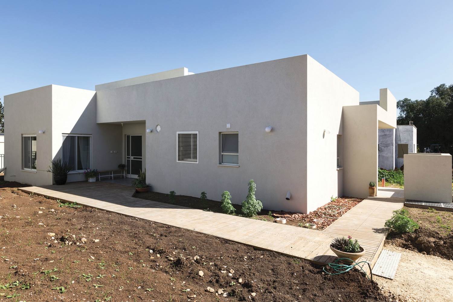 שטח 165 מ"ר, שלושה חדרי שינה ויחידה עם כניסה נפרדת (קליניקה, אורחים). חדר משפחה. דגש מיוחד על בניה אקולוגית - הצללות, איוורור (כולל מפוח איוורור), בידוד וחומרים (איטונג 30).