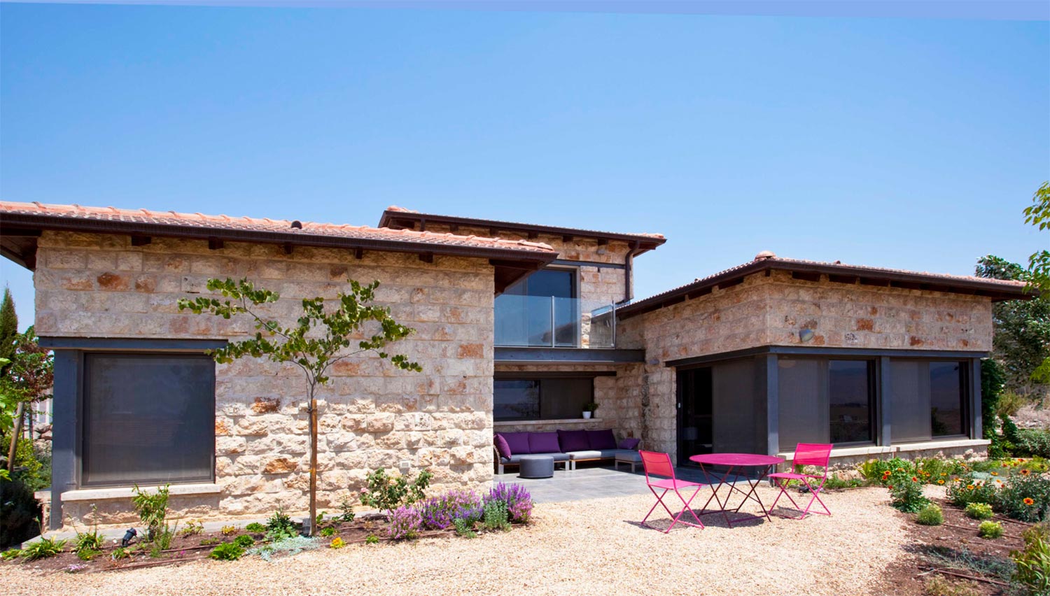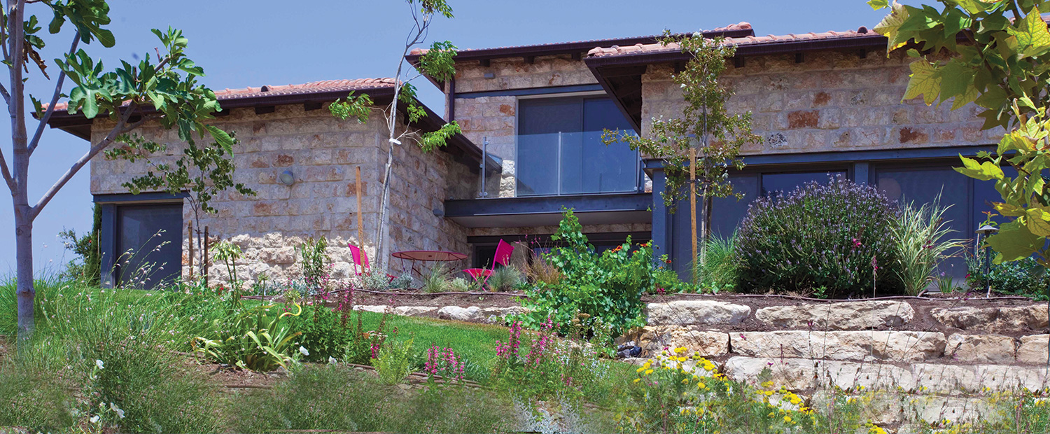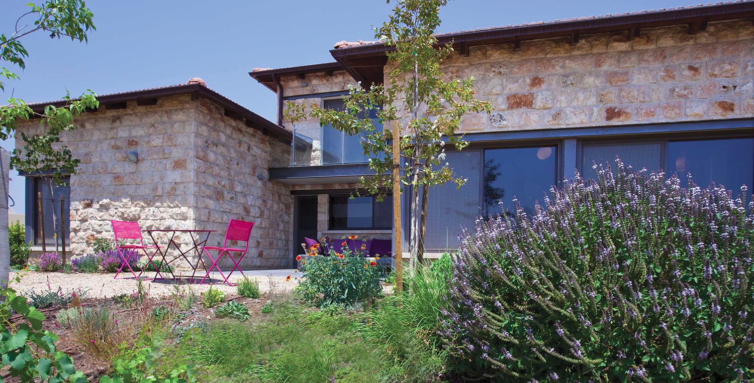 קירות חיצוניים בנויים אבן חירבה. חימום תת רצפתי. דגש מיוחד על העמדת המבנה לכיוון נוף העמק.